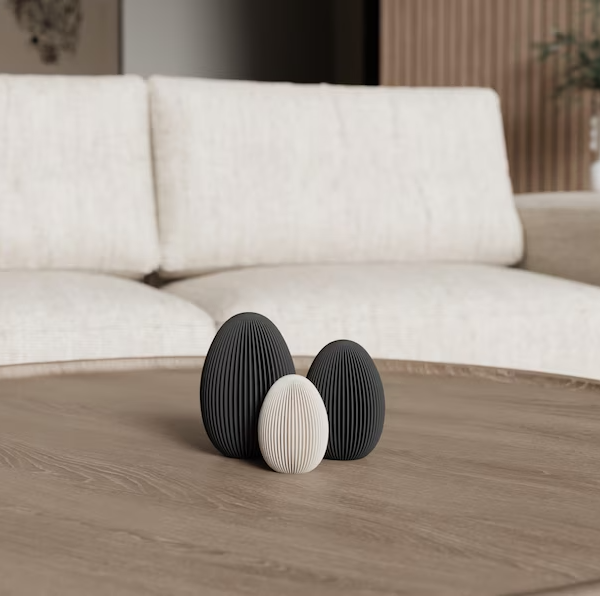 Dieses moderne 3er-Set dekorativer Eier überzeugt durch sein minimalistisches Design und eine außergewöhnliche Farbkombination. Ideal als Blickfang auf dem Couchtisch, Sideboard, Regal oder Treppen.